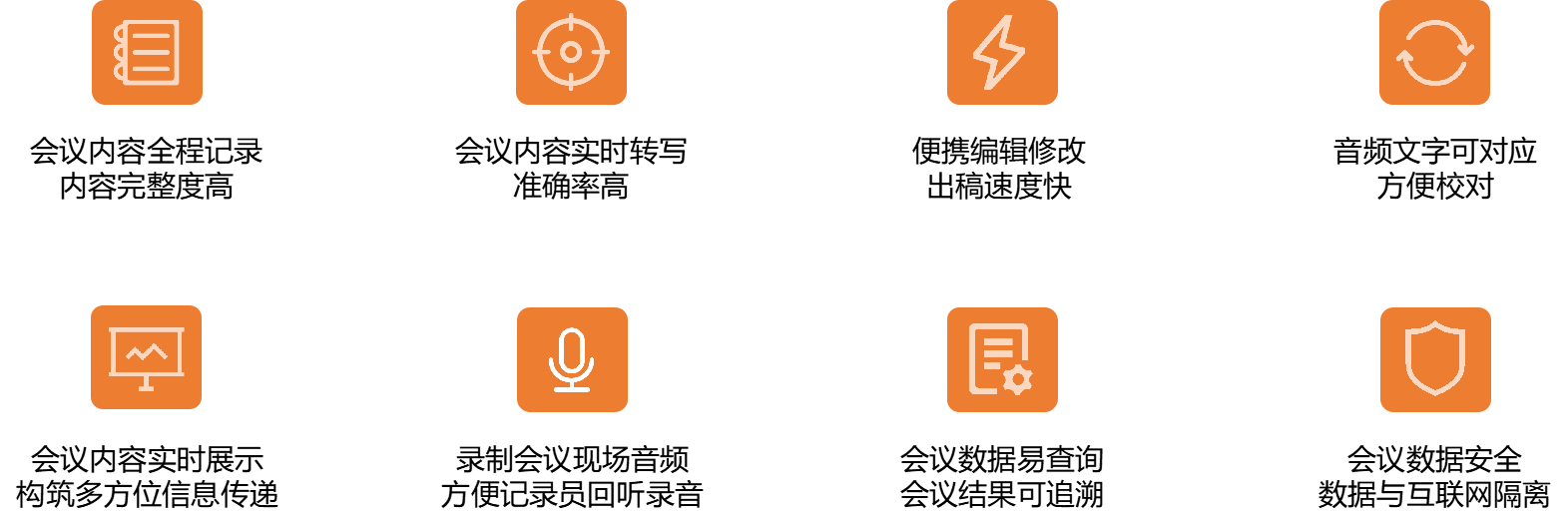 适用多种场景:适合办公会议、政府报告、新闻发布、学术讲座等各行业领域会议场景。非常适用政府企业、银行部门等无法使用公网语音识别服务的行业。