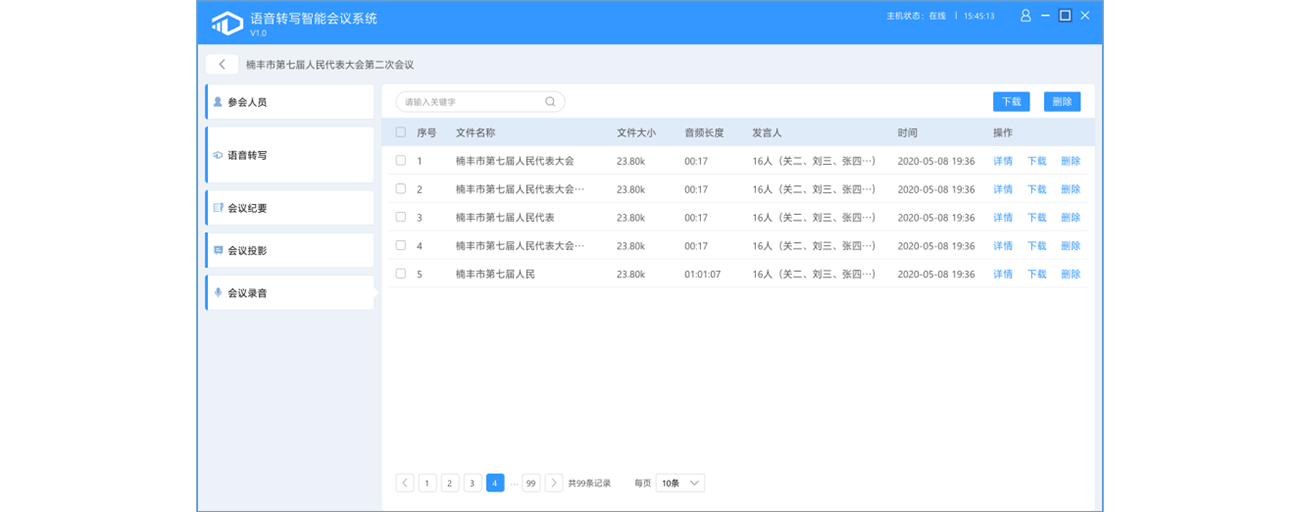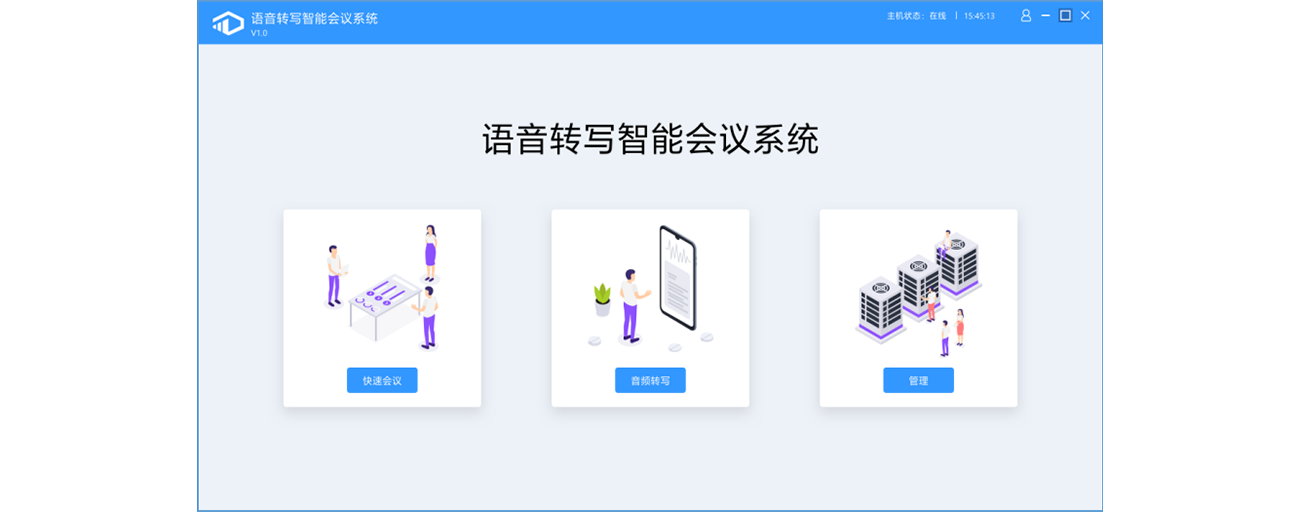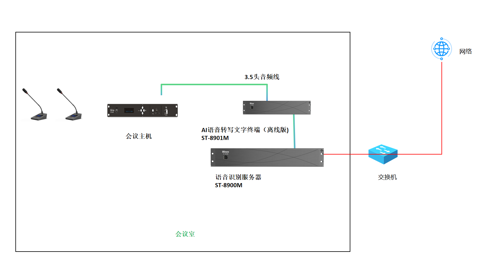 多会议室时配语音转写服务网络版,统一提供语音转写服务能力,支持多达32间会议室同时使用。每间会议室只需配备一台管理电脑和会议相关设备。