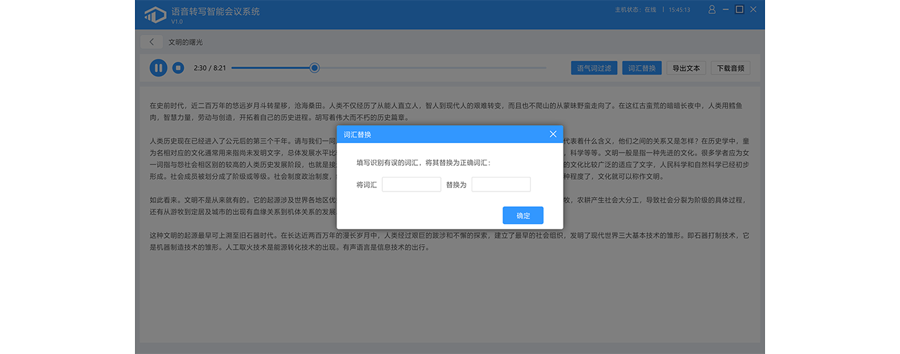 词汇替换:批量替换音频导入语音转写文本的内容,修正转写有误的文本。