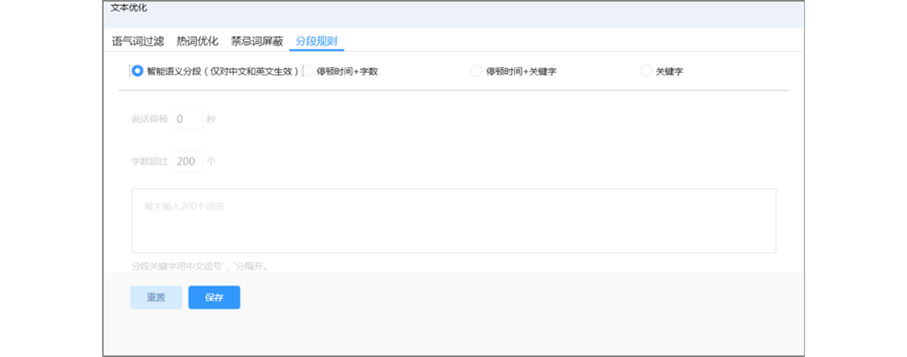 具备智能语义分段、停顿时间、字数、关键字多种组合模式文本分段,配置更灵活。