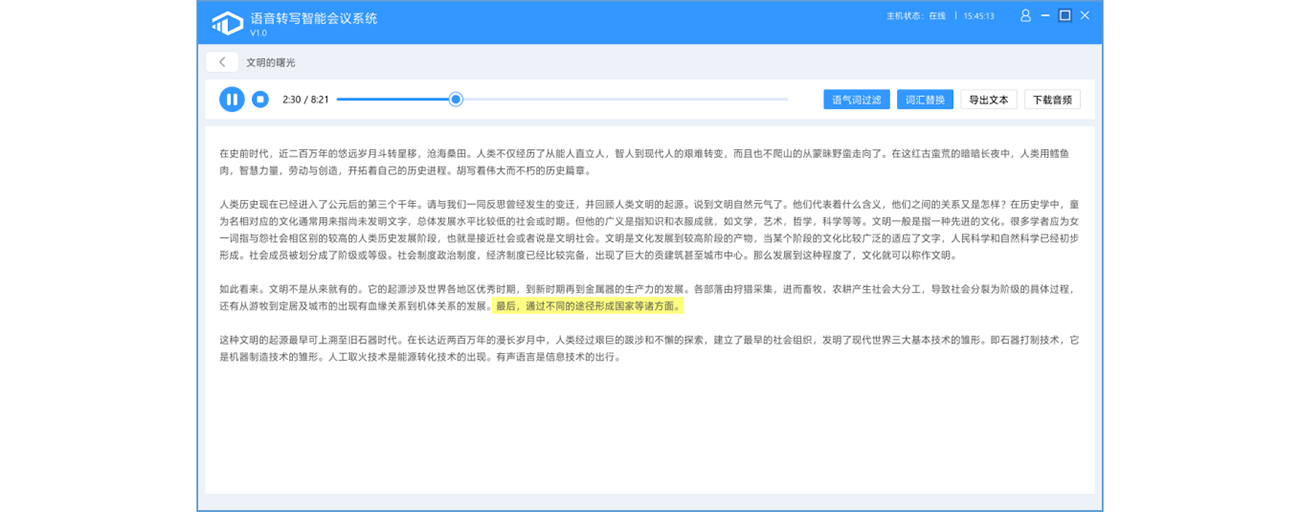 展板展示转写结果:语音转写展板展示语音转写文本内容,可对展板字体进行放大缩小和重点标记。自动同步展板纪要内容,实时展示语音转写文本。