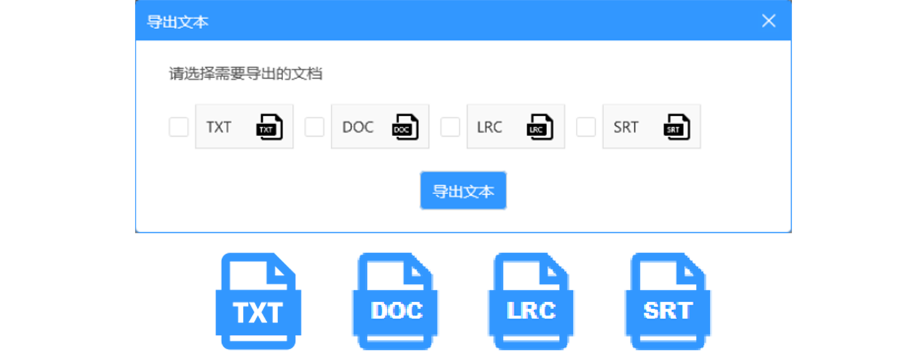 多格式导出:文本导出支持TXT、DOC、LRC、SRT多种格式文件导出。