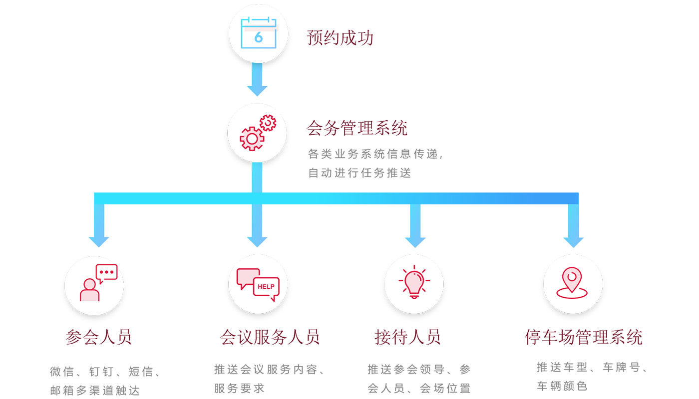 场景一:用户在OA系统中进行会议预约、会议审批后,通过API接口将数据流转至会务系统,在会务系统中,通过短信、邮件、电话、微信、钉钉等方式通知参会人员