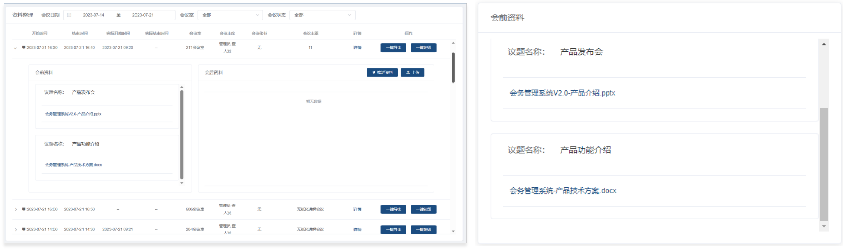会议资料:右侧分别显示会前上传的会议资料,会后上传的会议纪要