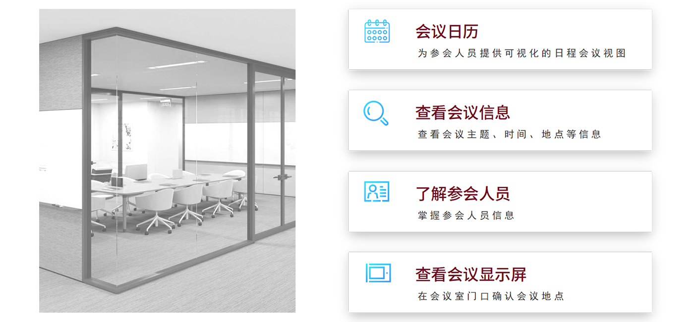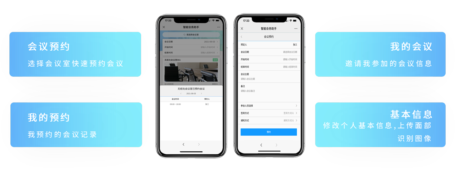 3、微信公众号预约系统(选配):使用单位可将企业信息与微信公众号进行绑定;会议预约时只需打开微信,进入公众号即可掌握会议室的空闲可预约时段,选择时间即可成功预约;同时基于公众号可快速掌握自己的会议日程安排。