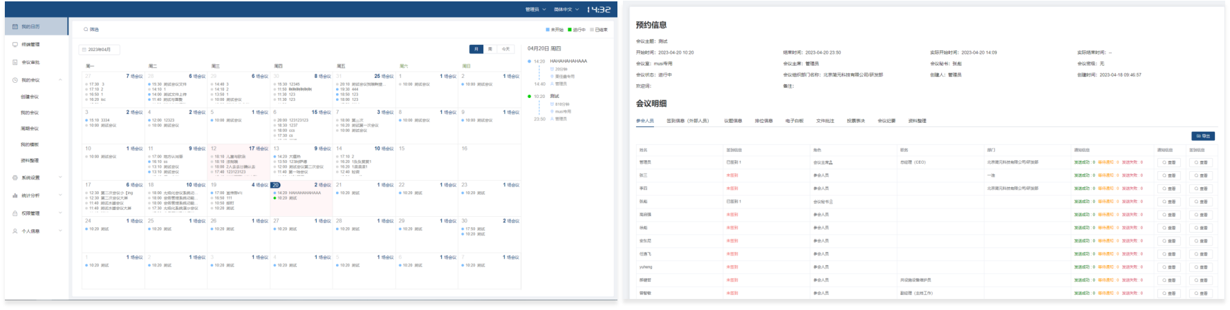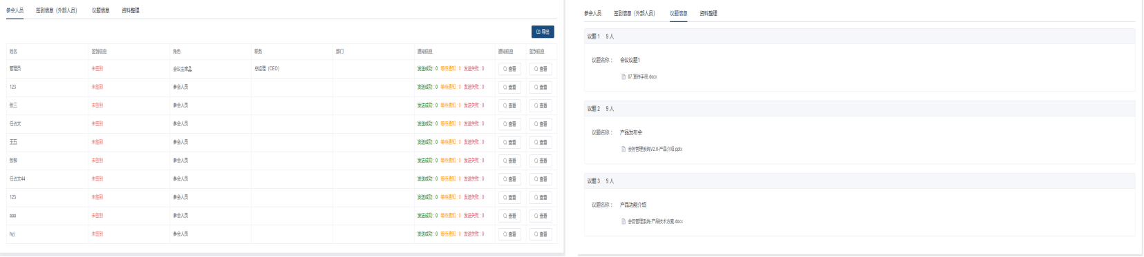 参会人员名单:通过列表展示本场会议的参会人员姓名、联系方式及角色