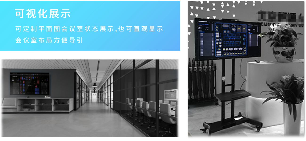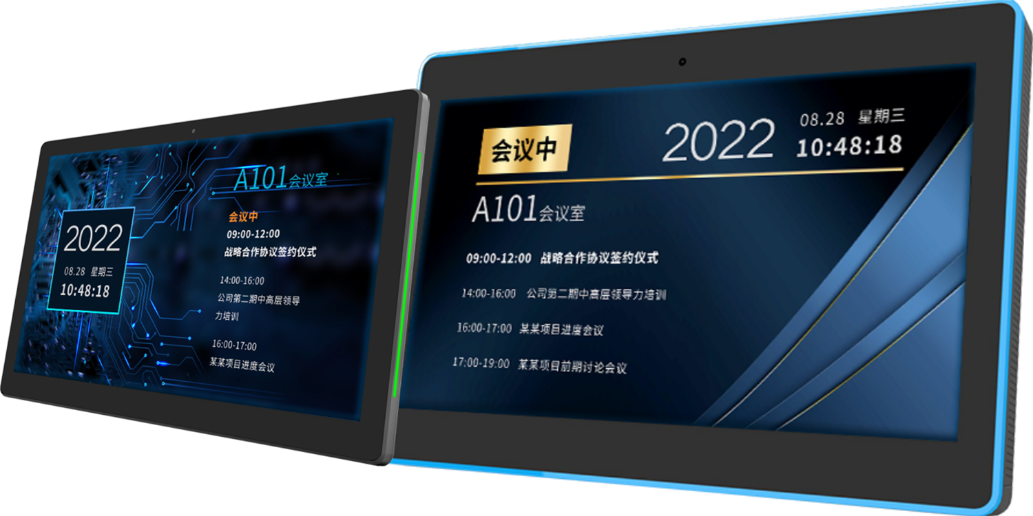 安装在会议室门口,可以挂墙也可以嵌入墙体安装。用来显示会议室名称、会议室使用状态、服务状态(会议中、下场会议时间)、当前日期时间、当天会议预约安排。