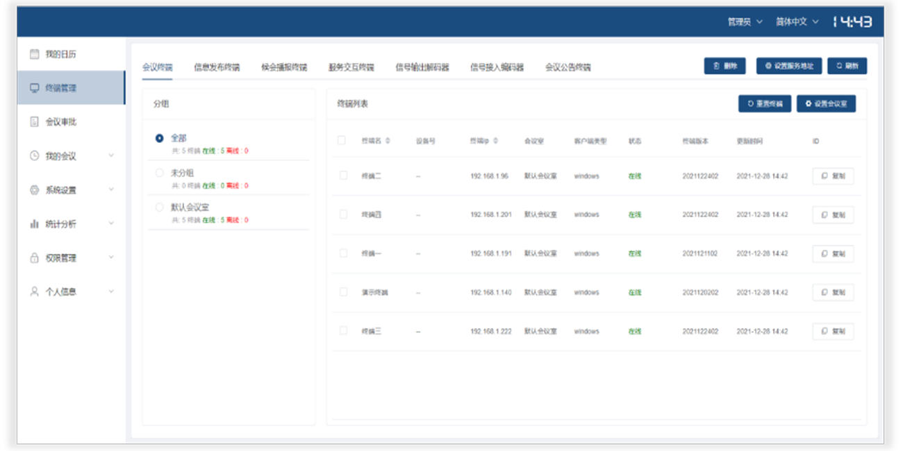 终端管理:无纸化会议系统具备较强的终端兼容能力,系统适配无纸化会议终端、电子门牌会议信息发布终端、候会室语音播报候会屏幕、服务屏、会议室内上屏控制器、接入控制器、电子公告终端等设备。终端管理即为对所有的会议室匹配信息化建设终端进行统一的管理、分组、维护。